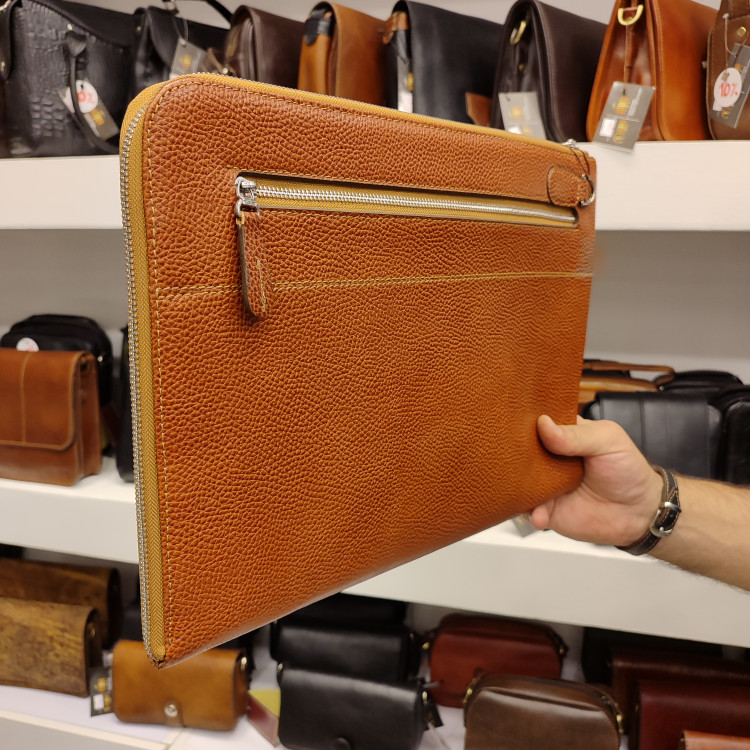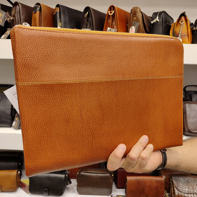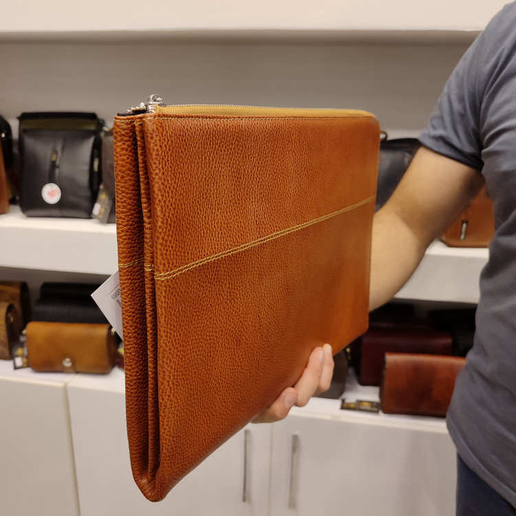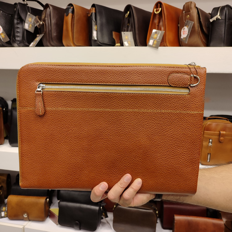 کیف کلاسوری چرمی ساخته شده از چرم گاوی فلوتر،دارای دو فضای اصلی با فضاهای مخصوص لوازم شخصی و تسمه دور مچ و زیپ دیواره بیرونی می باشد.