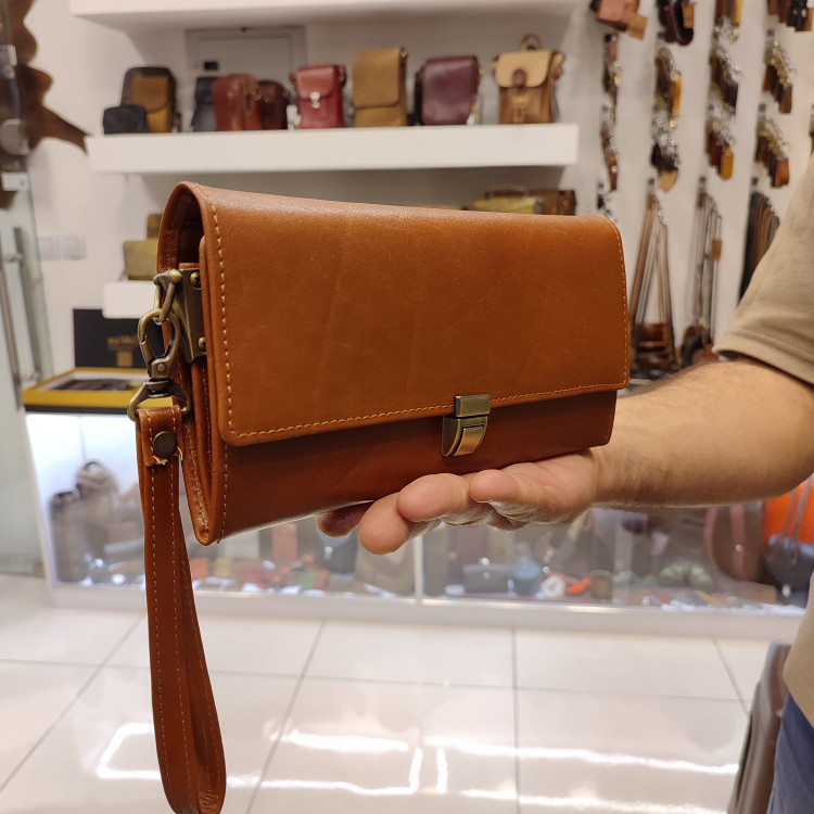 کیف دستی چرمی ساخته شده از چرم گاوی درجه یک، دارای سه فضای مفید با جای کارت و مدارک و دو فضای زیپ دار و قفل ناخنی محافظ و بند دور مچ
