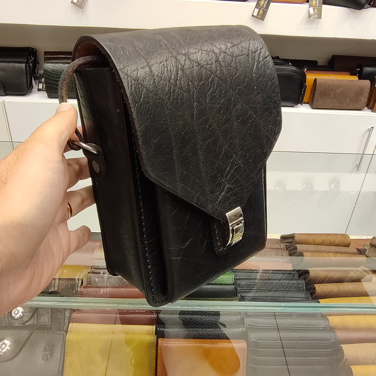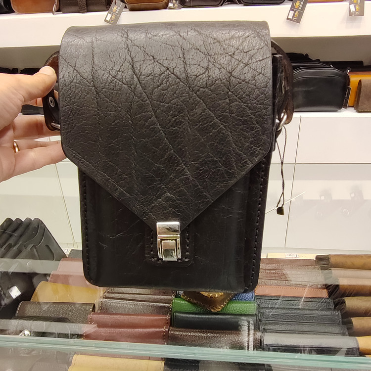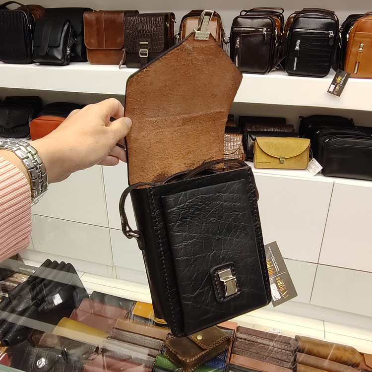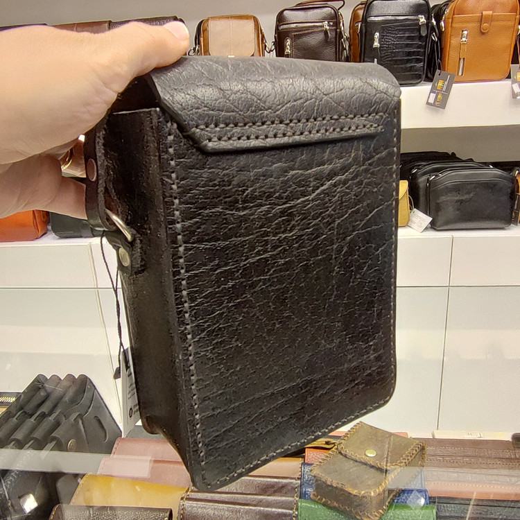 کیف گاومیشی رودوشی دست دوز ساخته شده از چرم گاومیش ضخیم ونخ موم اندود، دارای یک فضای اصلی ویک فضای بزرگ جلو کیف می باشد.لوازم داخل کیف ضد ضربههستند