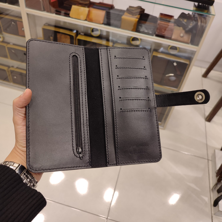 کیف دستی چرمی ساخته شده از چرم گاوی شبرو(ساده), دارای جای موبایل بیرونی و ۶ جاکارتی و جای موبایل و مدارک داخلی و تسمه با قفل مگنتی نقره ای است.