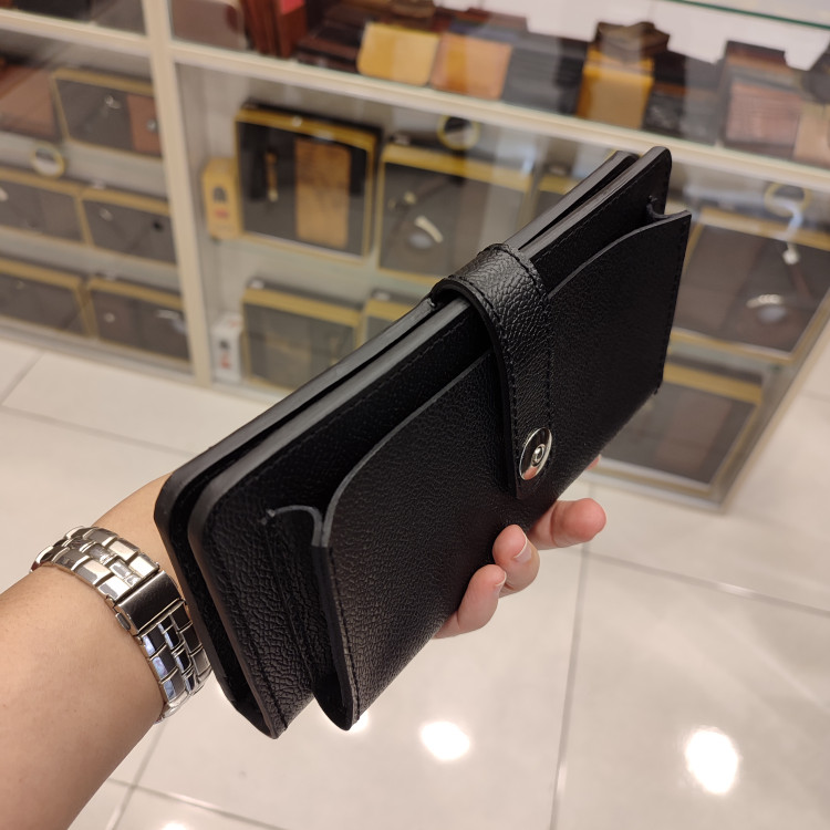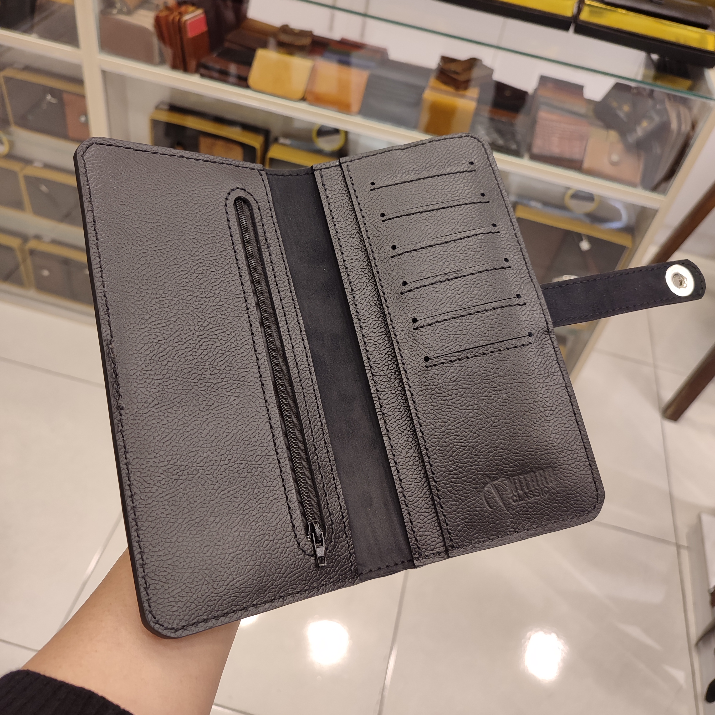 کیف دستی چرمی ساخته شده از چرم گاوی پرینچ اعلا، دارای جای موبایل بیرونی و ۶ جاکارتی و جای موبایل و مدارک داخلی و تسمه با قفل مگنتی است.