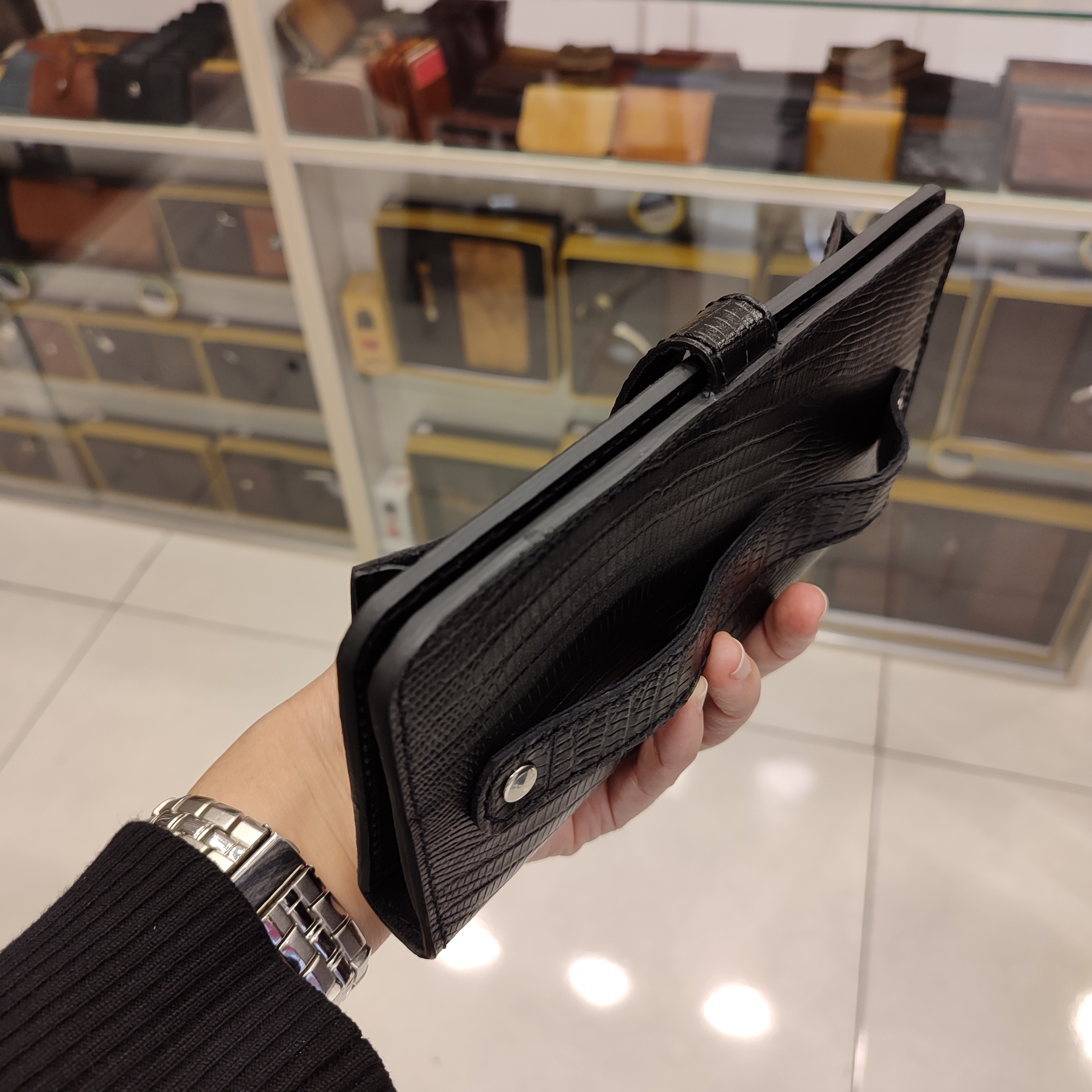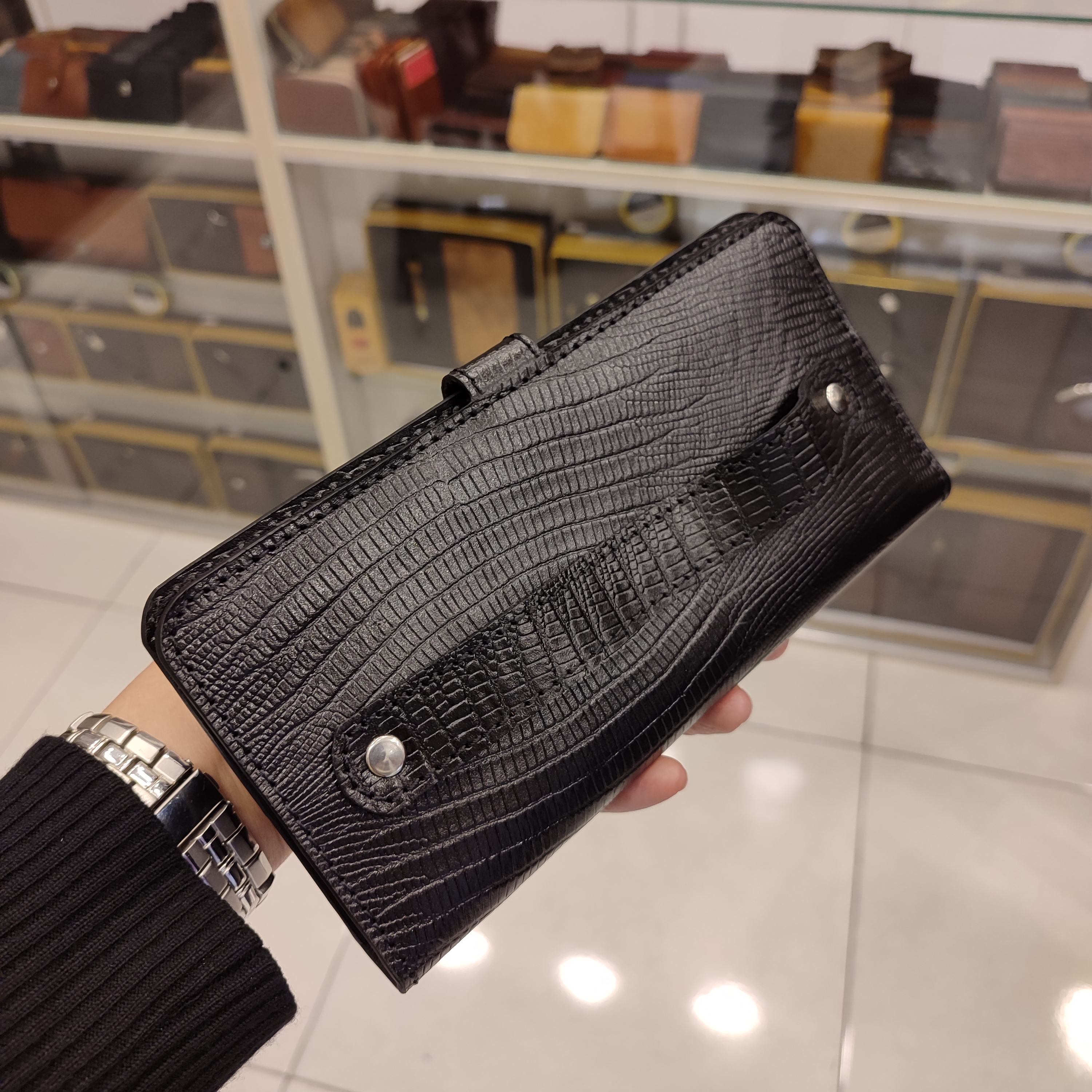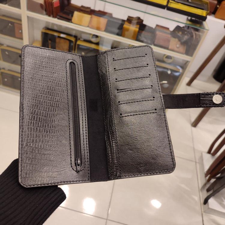 کیف دستی چرمی ساخته شده از چرم گاوی لیزارد, دارای جای موبایل بیرونی و ۶ جاکارتی و جای موبایل و مدارک داخلی و تسمه با قفل مگنتی و تسمه پشت ضدسرقت انگلیسی است.