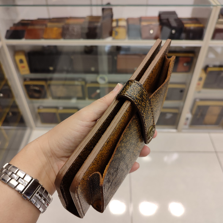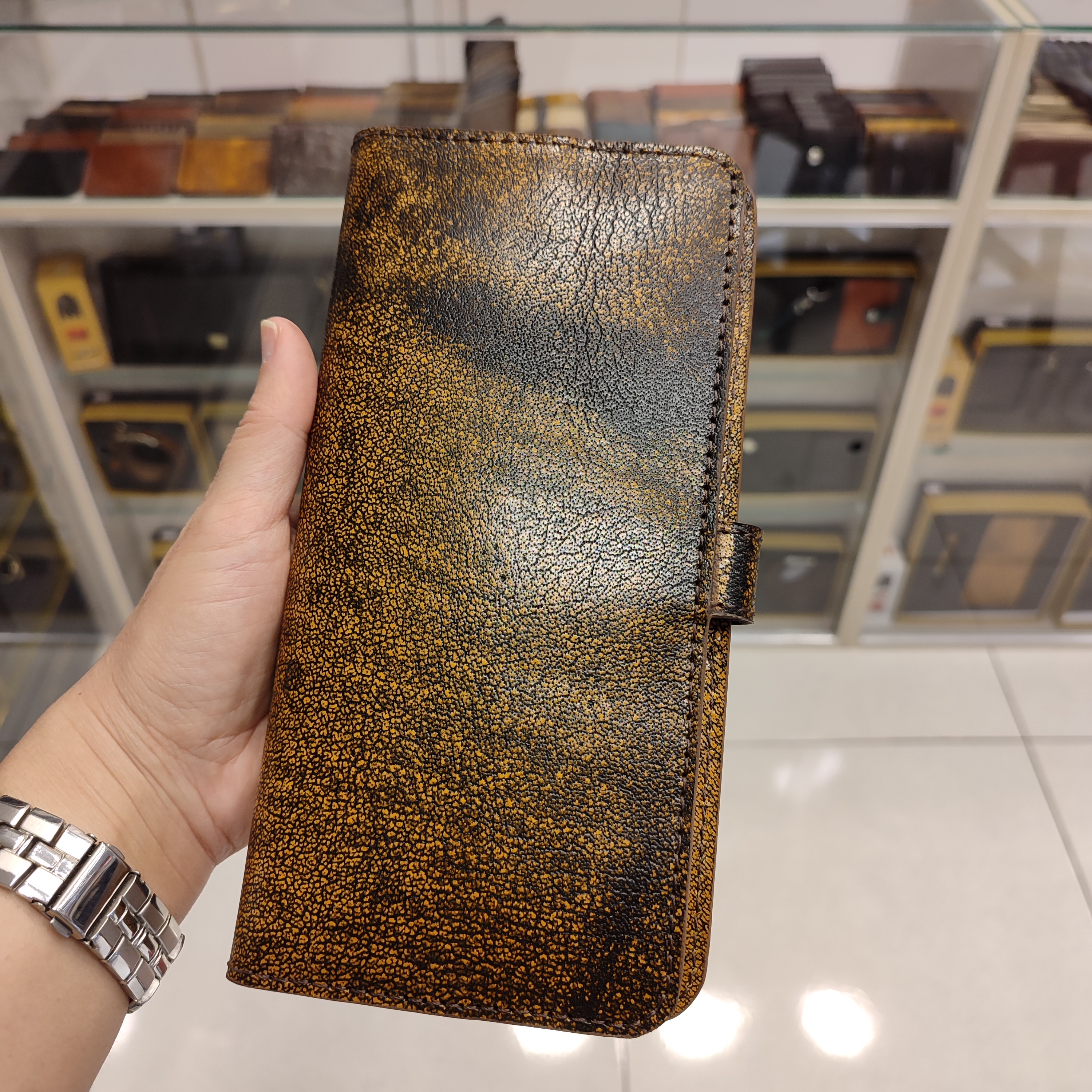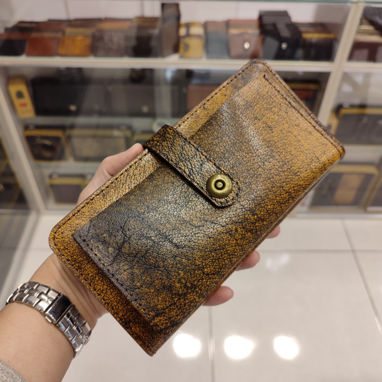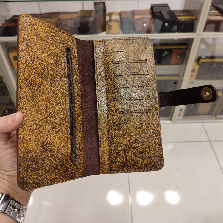 کیف دستی چرمی ساخته شده از چرم گاومیش رگه دار زیبا درجه یک، دارای جای موبایل بیرونی و ۶ جاکارتی و جای موبایل و مدارک داخلی و قفل مگنتی است.