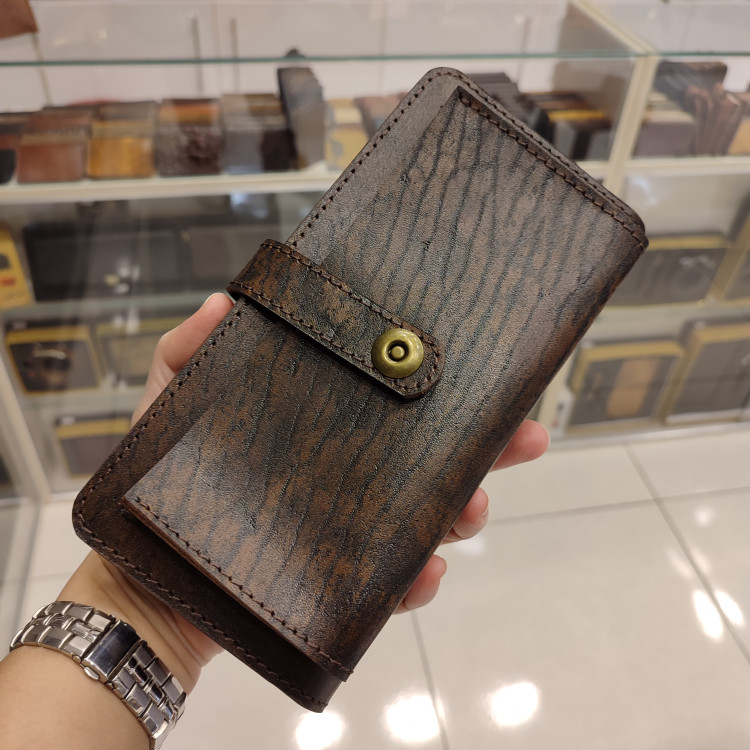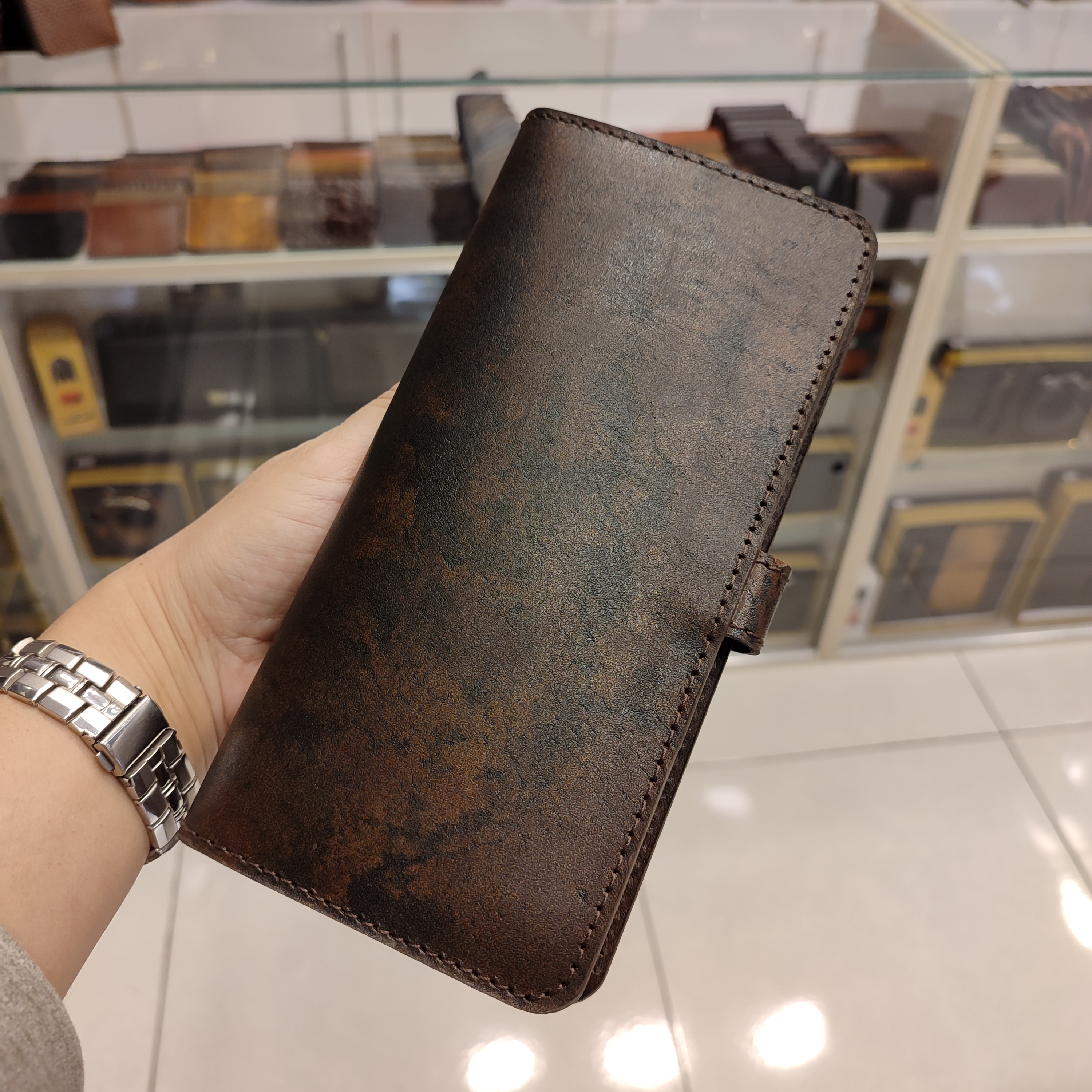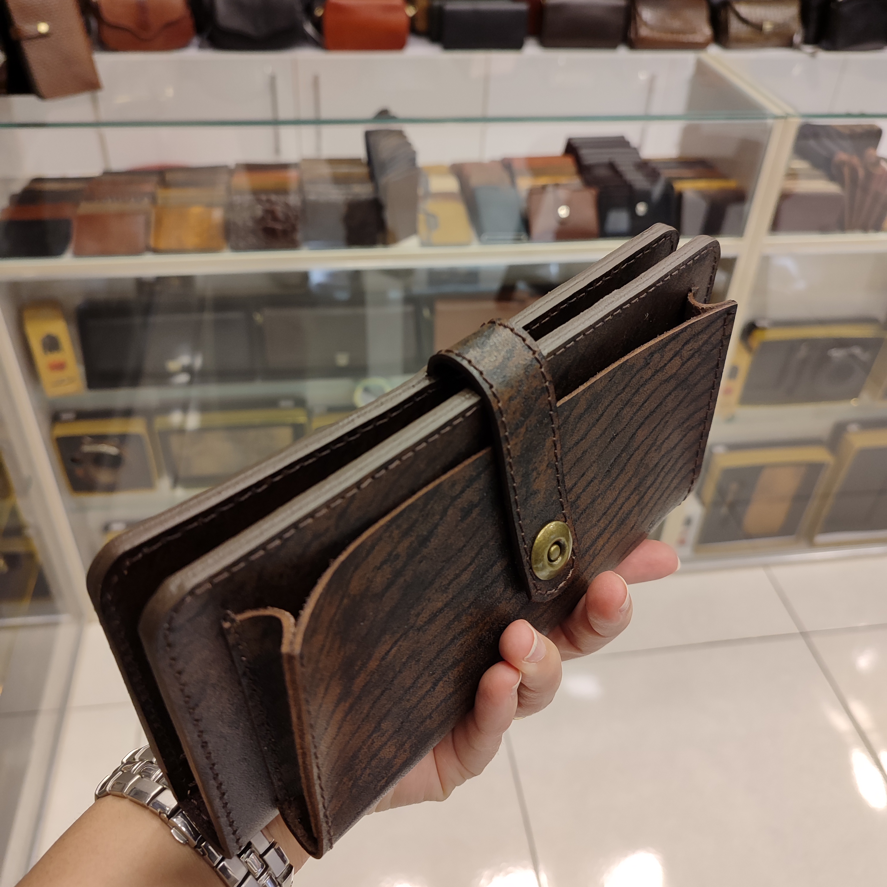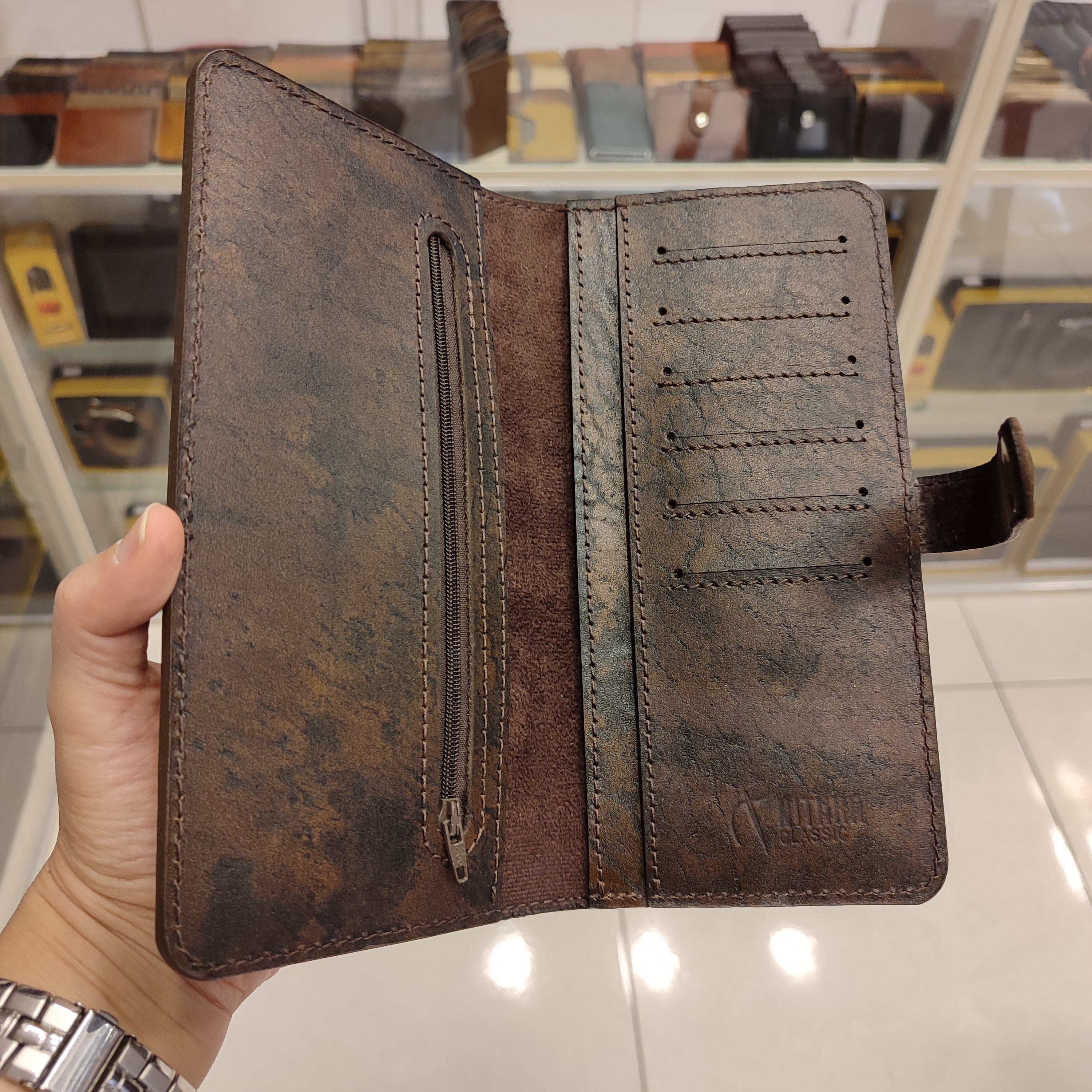 کیف دستی چرمی ساخته شده از چرم گاومیش رگه دار زیبا درجه یک، دارای جای موبایل بیرونی و ۶ جاکارتی و جای موبایل و مدارک داخلی و تسمه با قفل مگنتی است.