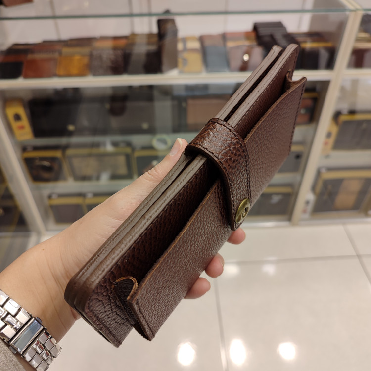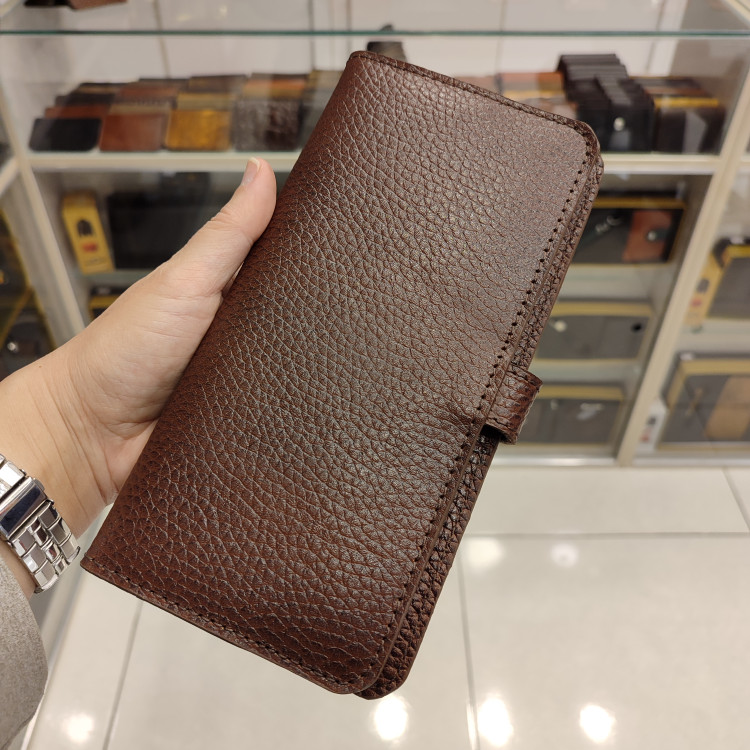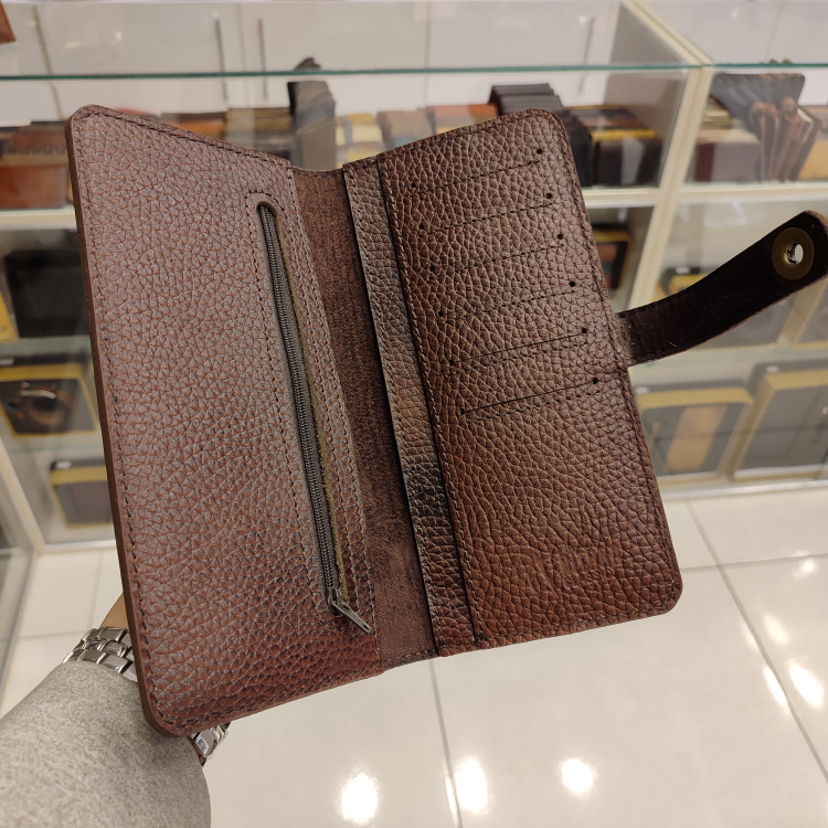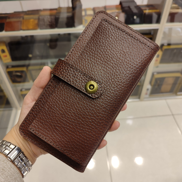 کیف دستی چرمی ساخته شده از چرم گاوی عنابی تیره درجه یک، دارای جای موبایل بیرونی و ۶ جاکارتی و جای موبایل و مدارک داخلی و تسمه با قفل مگنتی است.