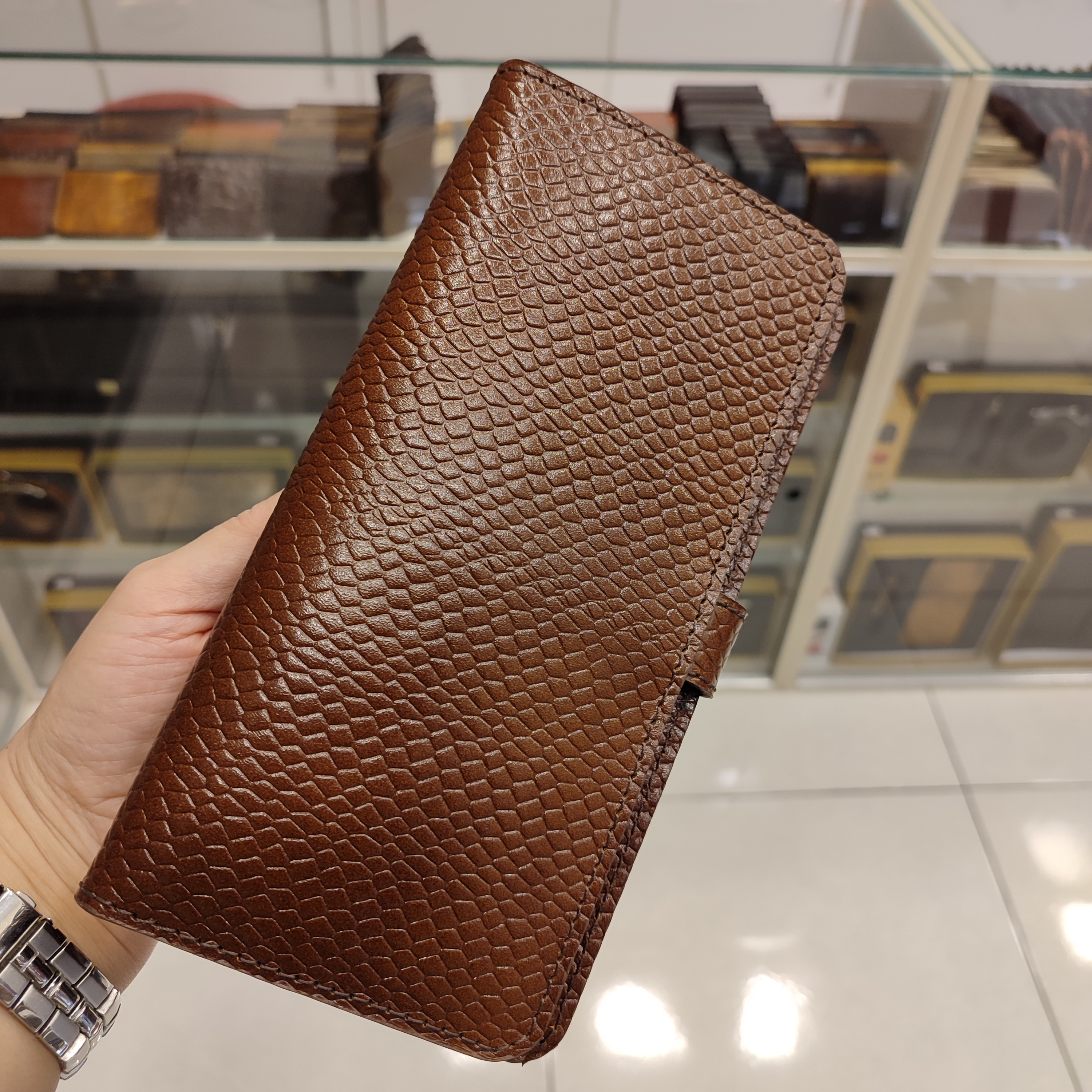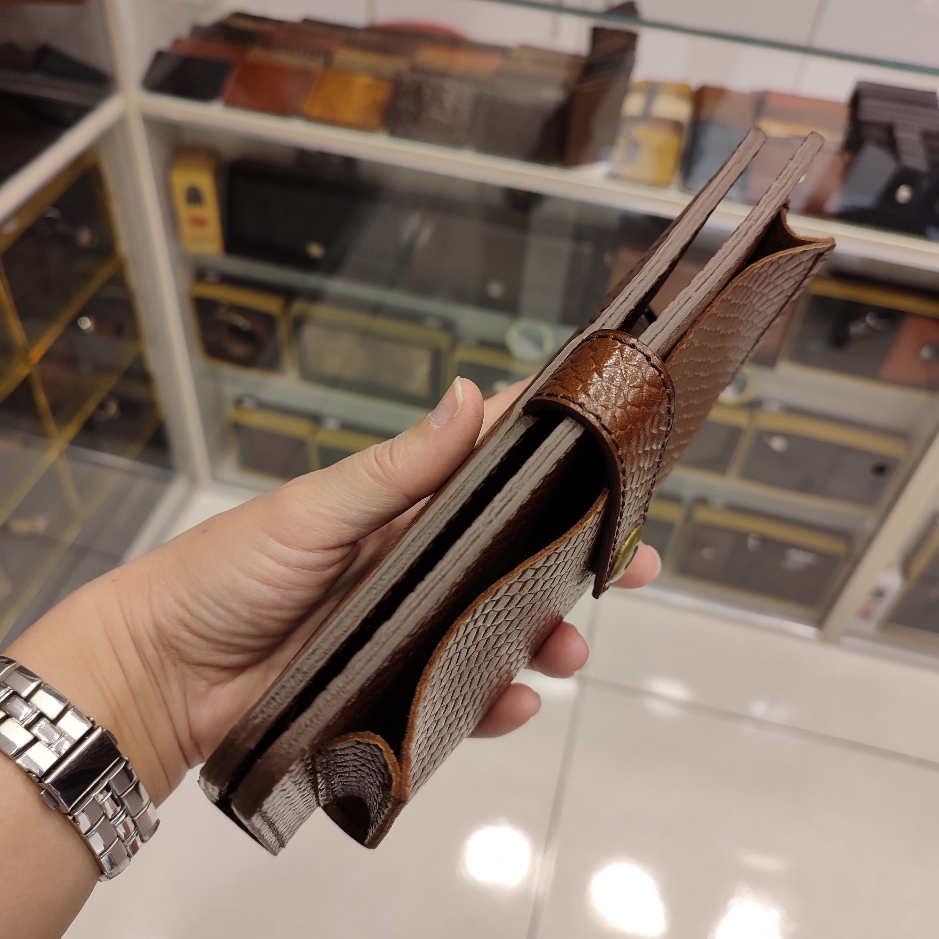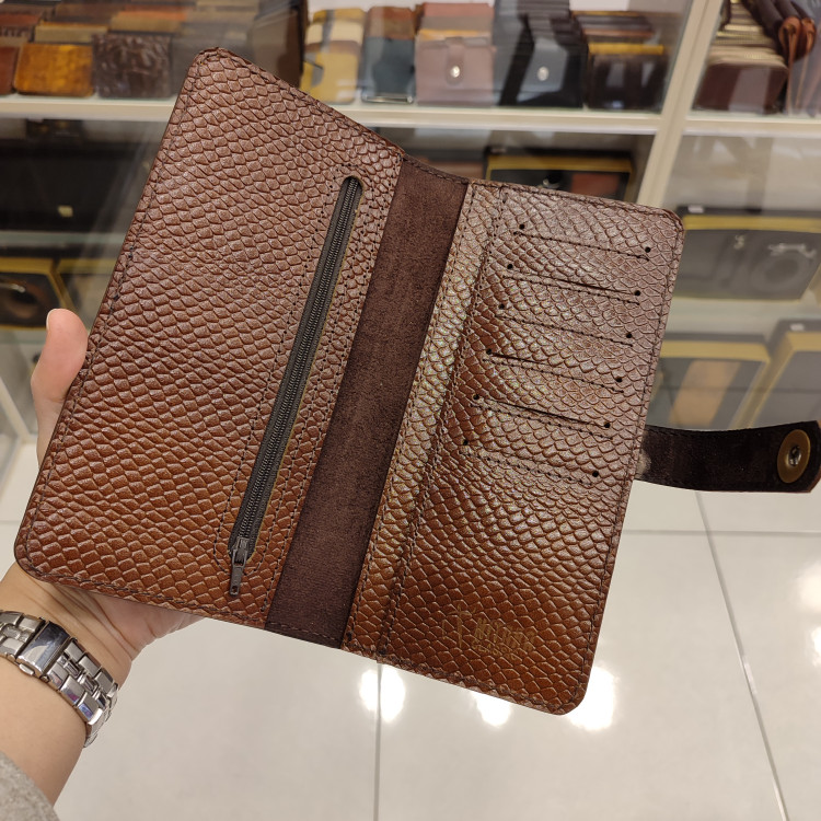 کیف دستی چرمی ساخته شده از چرم گاوی پوست ماری زیبا قهوه ای درجه یک، دارای جای موبایل بیرونی و ۶ جاکارتی و جای موبایل و مدارک داخلی و قفل مگنتی است.