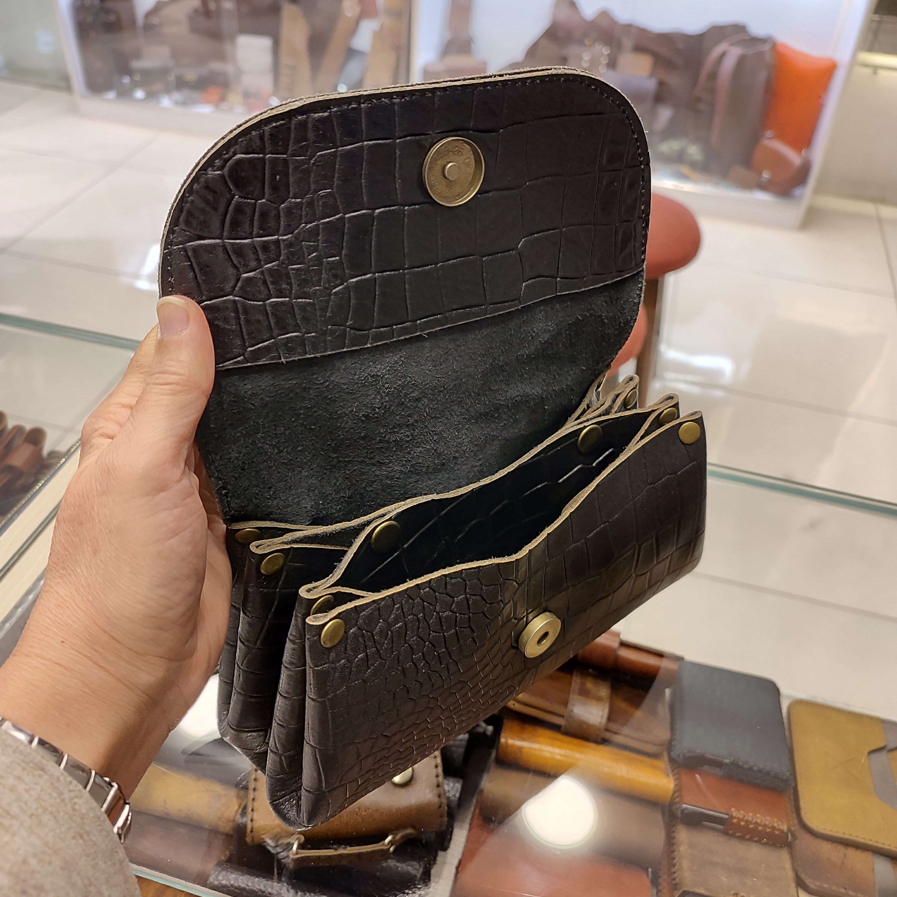 کیف رودوشی تاینی آکاردئونی ساخته شده از چرم گاوی طرح سرامیکی، دارای فضاهای آکاردئونی تفکیکی دکمه دار و بند دوشی بلند، بسیار زیبا و جادار و سبک است.