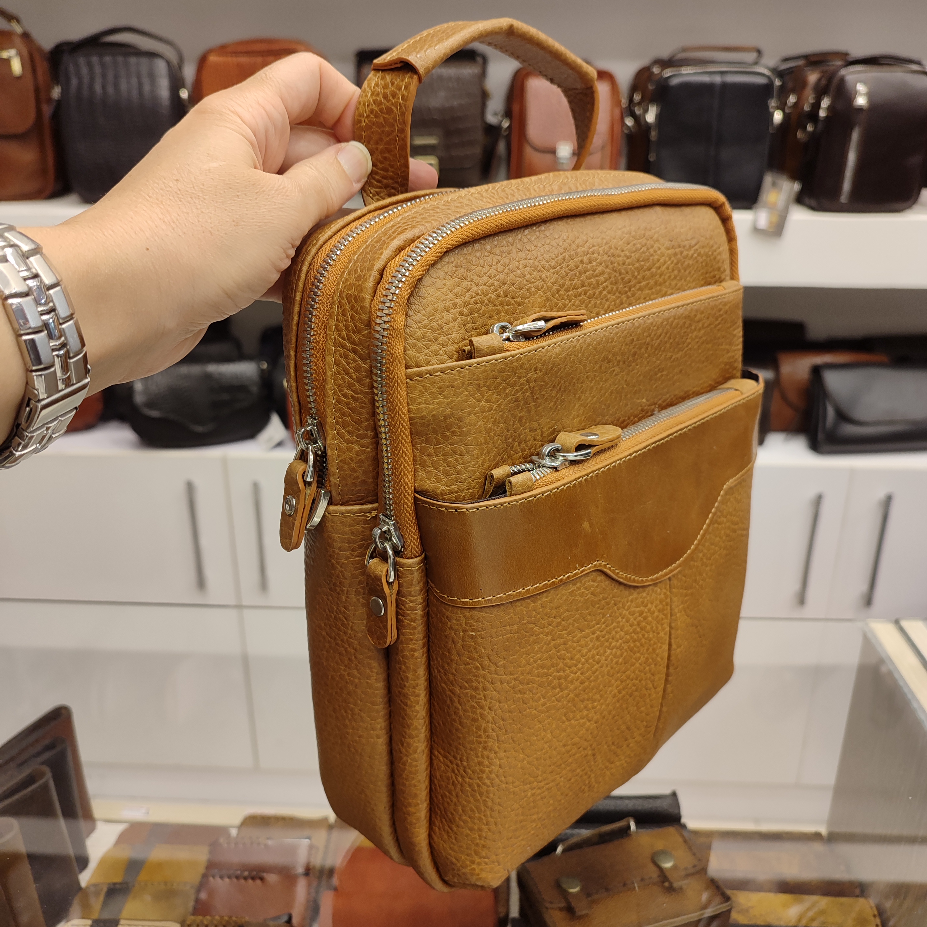 کیف رودوشی چرمی ساخته شده از چرم گاوی اعلا، دارای ۵ فضای زیپ دار و یک جیب پشت و یراق فلزی درجه یک، بند رودوشی و دسته بالایی است.