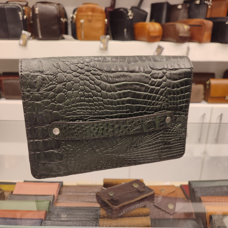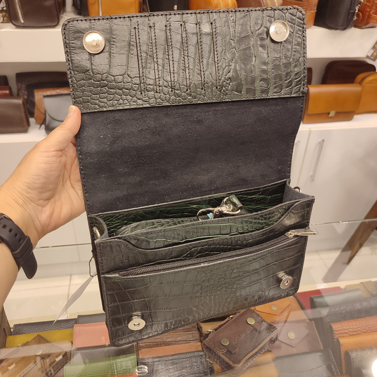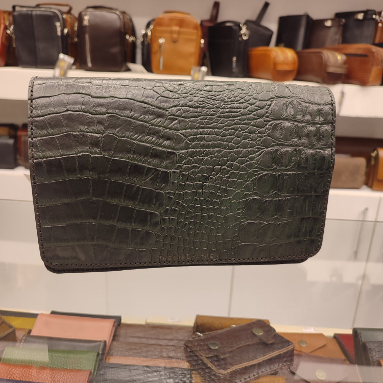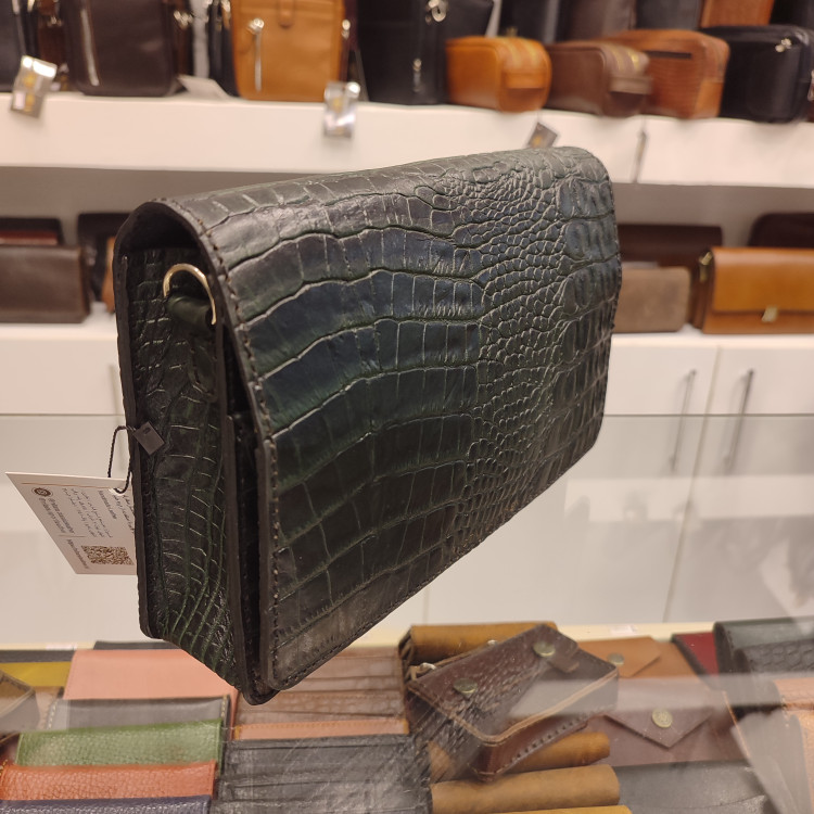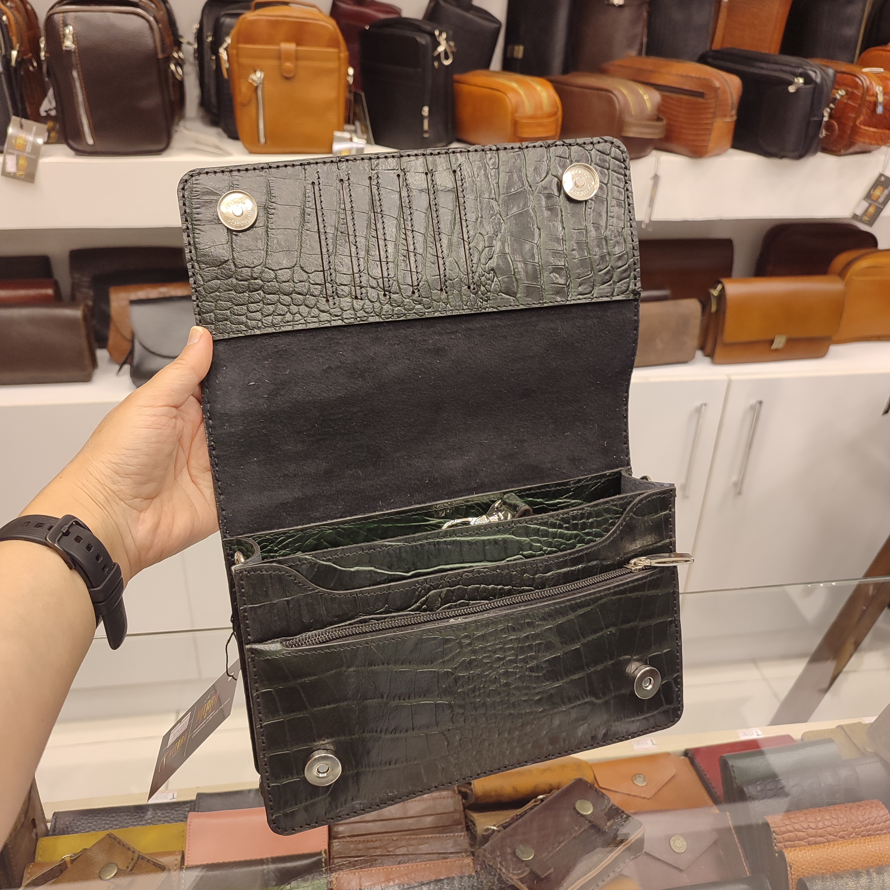 کیف دستی دوشی دست ساز ساخته شده با چرم گاوی کروکودیلی، دارای بنددوشی، بندمچی،تسمه ضدسرقت پشت، دارای فضاهای تفکیکی داخلی و ۶جای کارت و فضای زیپ دار است