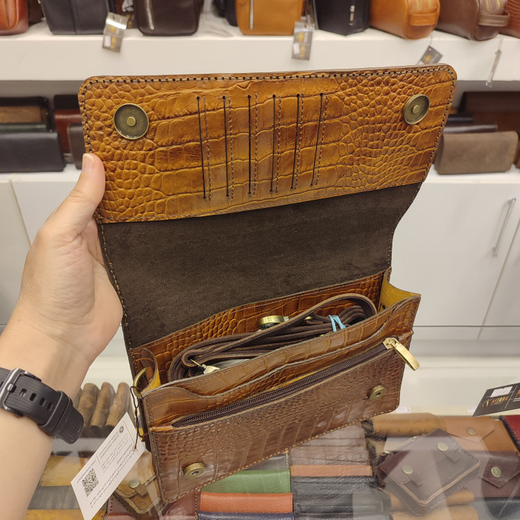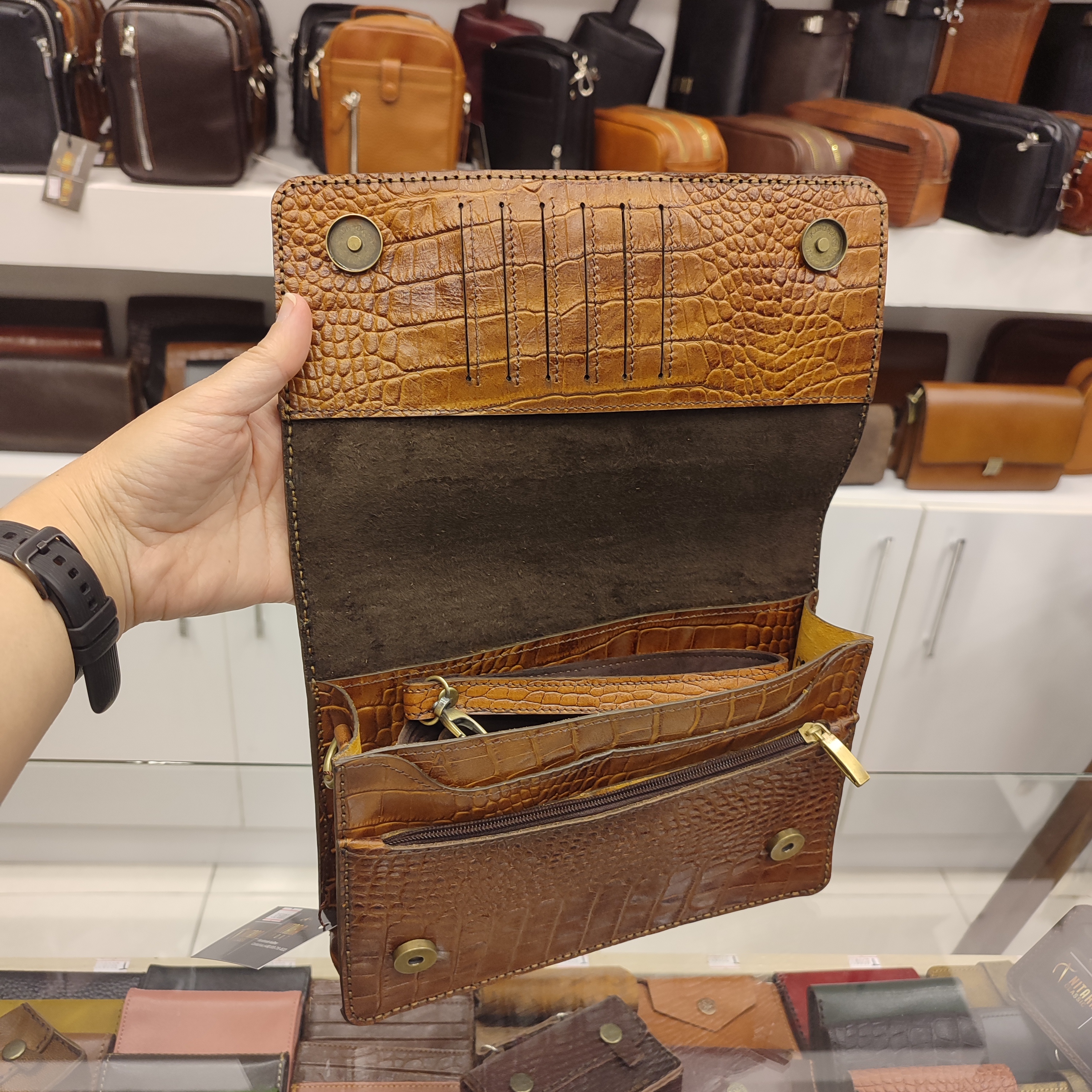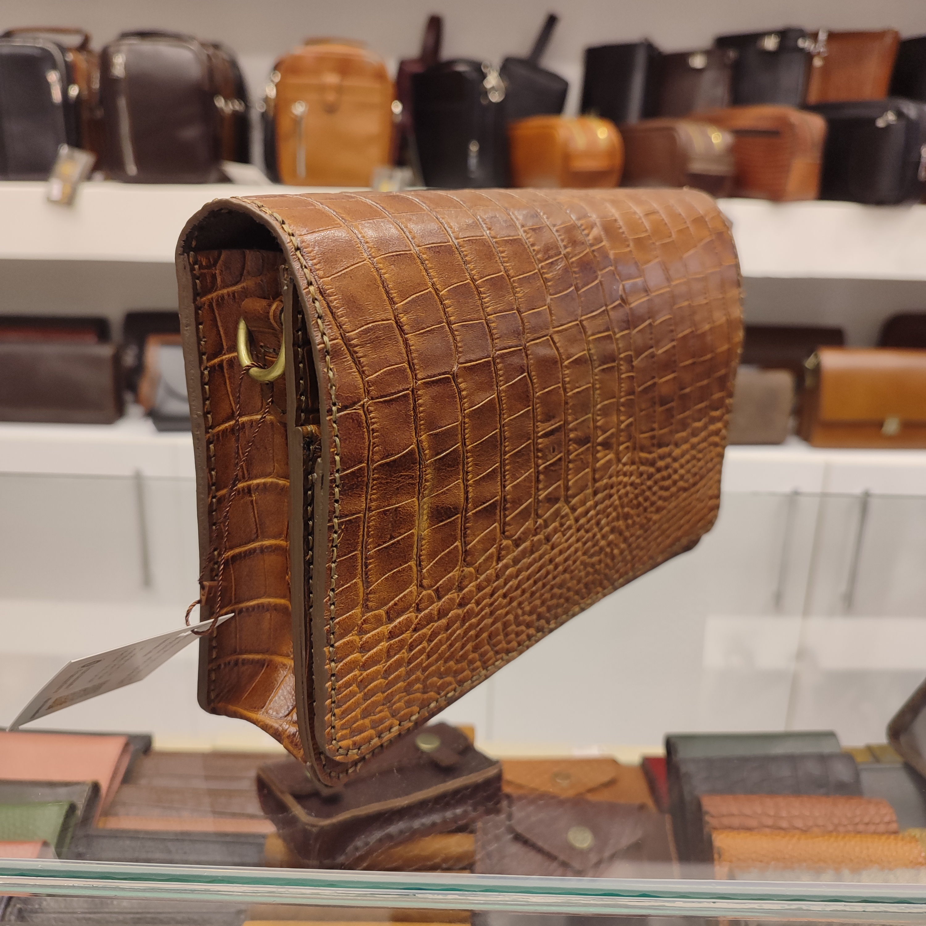کیف دستی دوشی دست ساز ساخته شده با چرم گاوی کروکودیلی، دارای بنددوشی، بندمچی،تسمه ضدسرقت پشت، دارای فضاهای تفکیکی داخلی و ۶جای کارت و فضای زیپ دار است