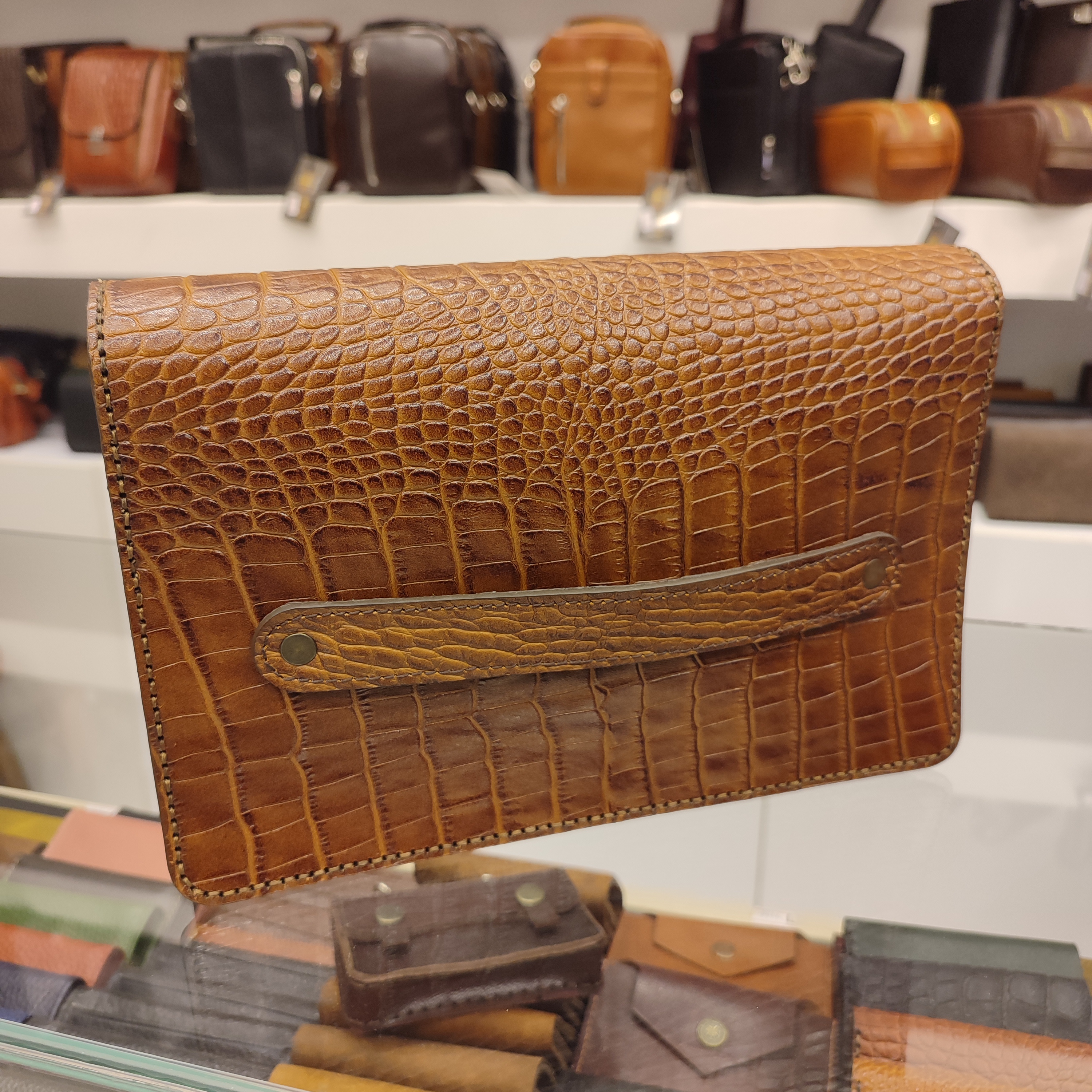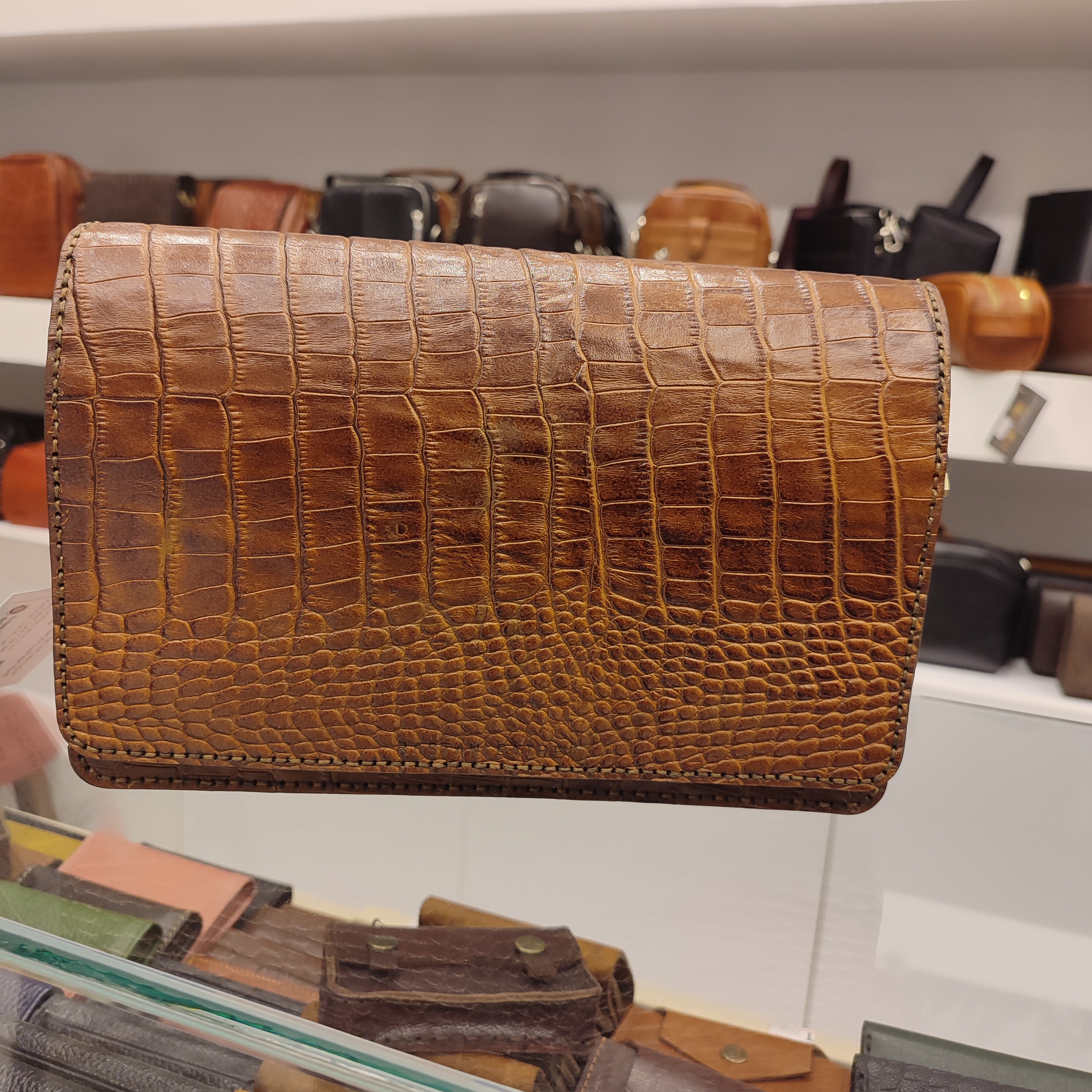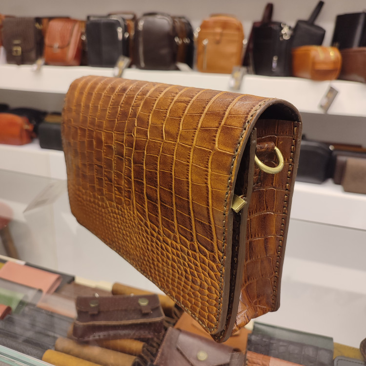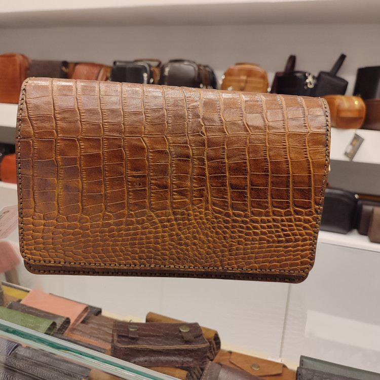 کیف دستی دوشی دست ساز ساخته شده با چرم گاوی کروکودیلی، دارای بنددوشی، بندمچی،تسمه ضدسرقت پشت، دارای فضاهای تفکیکی داخلی و ۶جای کارت و فضای زیپ دار است