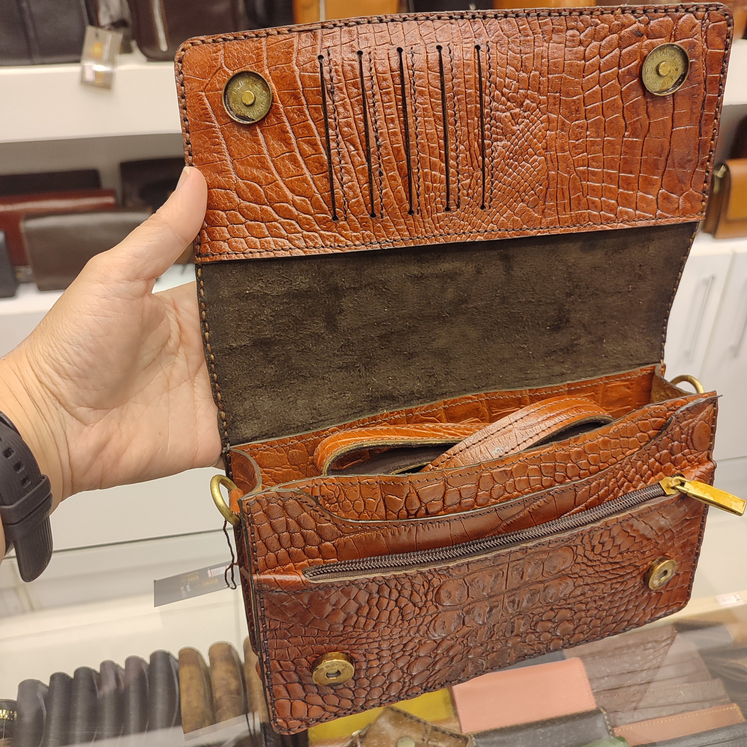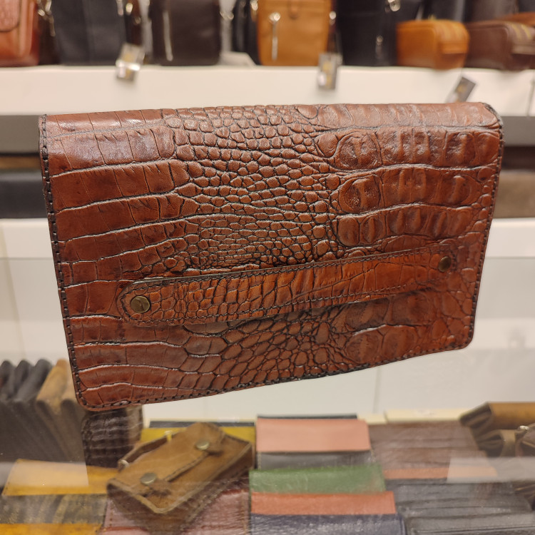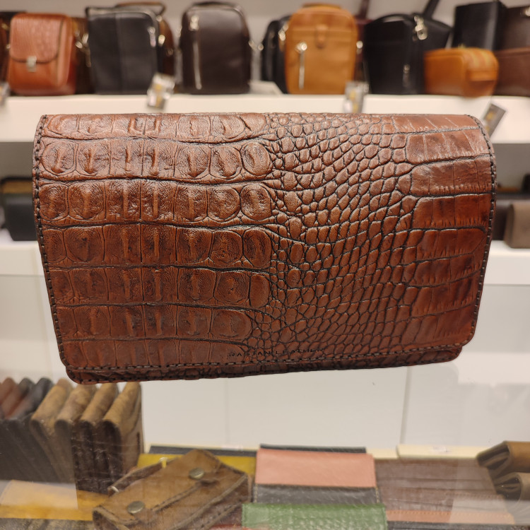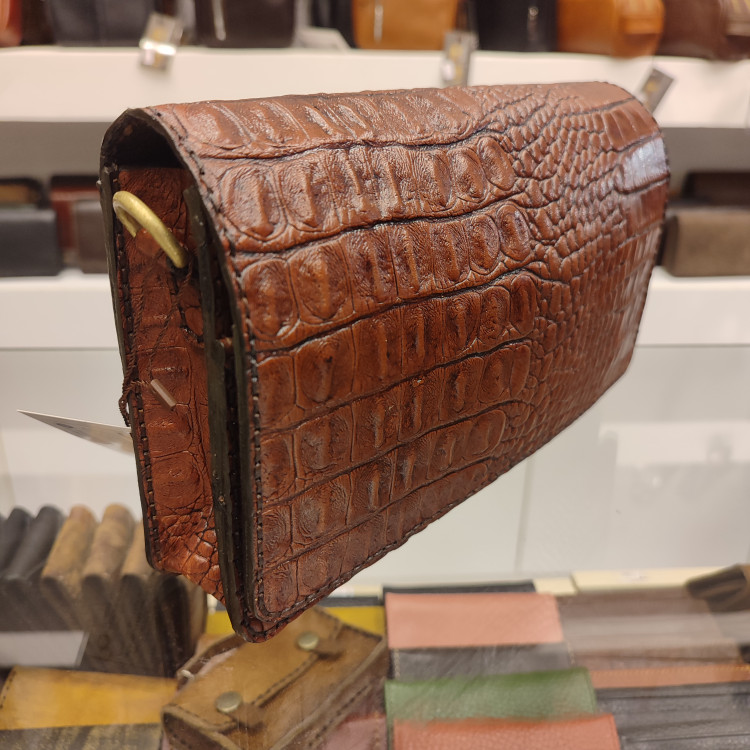 کیف دستی دوشی دست ساز ساخته شده با چرم گاوی کروکودیلی،دارای بنددوشی، بندمچی،تسمه ضدسرقت پشت، دارای فضاهای تفکیکی داخلی و ۵ جای کارت و فضای زیپ دار است