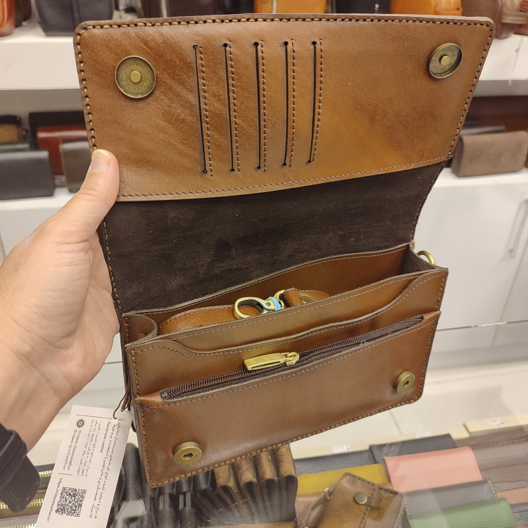 کیف دستی دوشی دست ساز ساخته شده با چرم گاوی درجه یک، دارای بنددوشی، بندمچی،تسمه ضدسرقت پشت، دارای فضاهای تفکیکی داخلی و ۵ جای کارت و فضای زیپ دار است