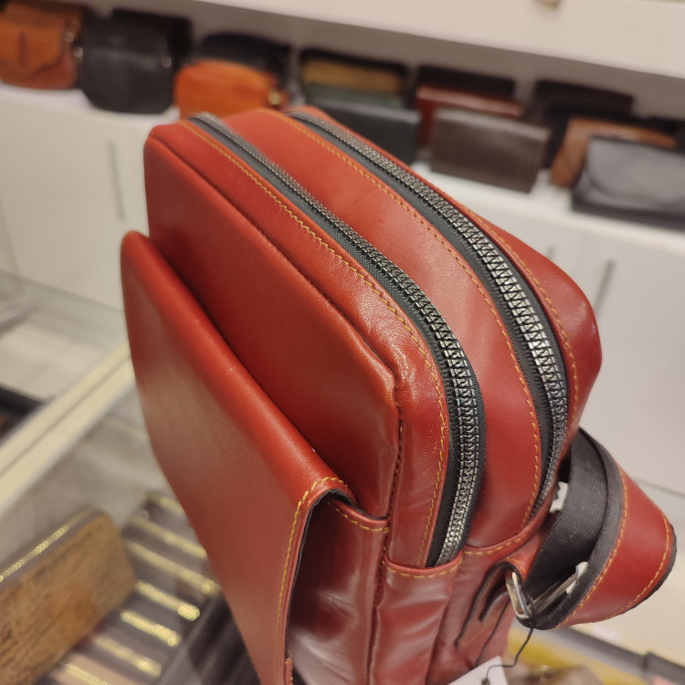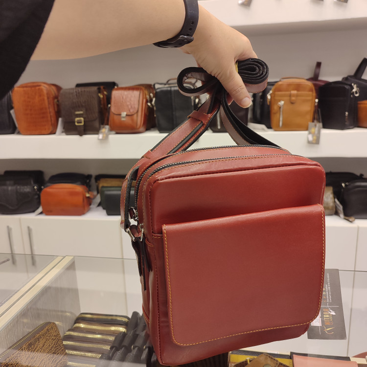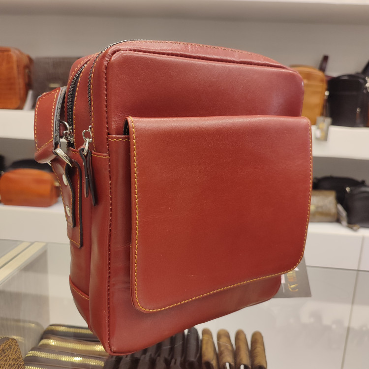 کیف رودوشی چرمی ساخته شده از چرم گاوی، دارای دو فضای اصلی زیپ دار و یک جیب بزرگ جلو و زیپ پشت، یراق فلزی و مناسب برای استفاده روزمره و سفری است.