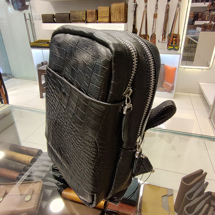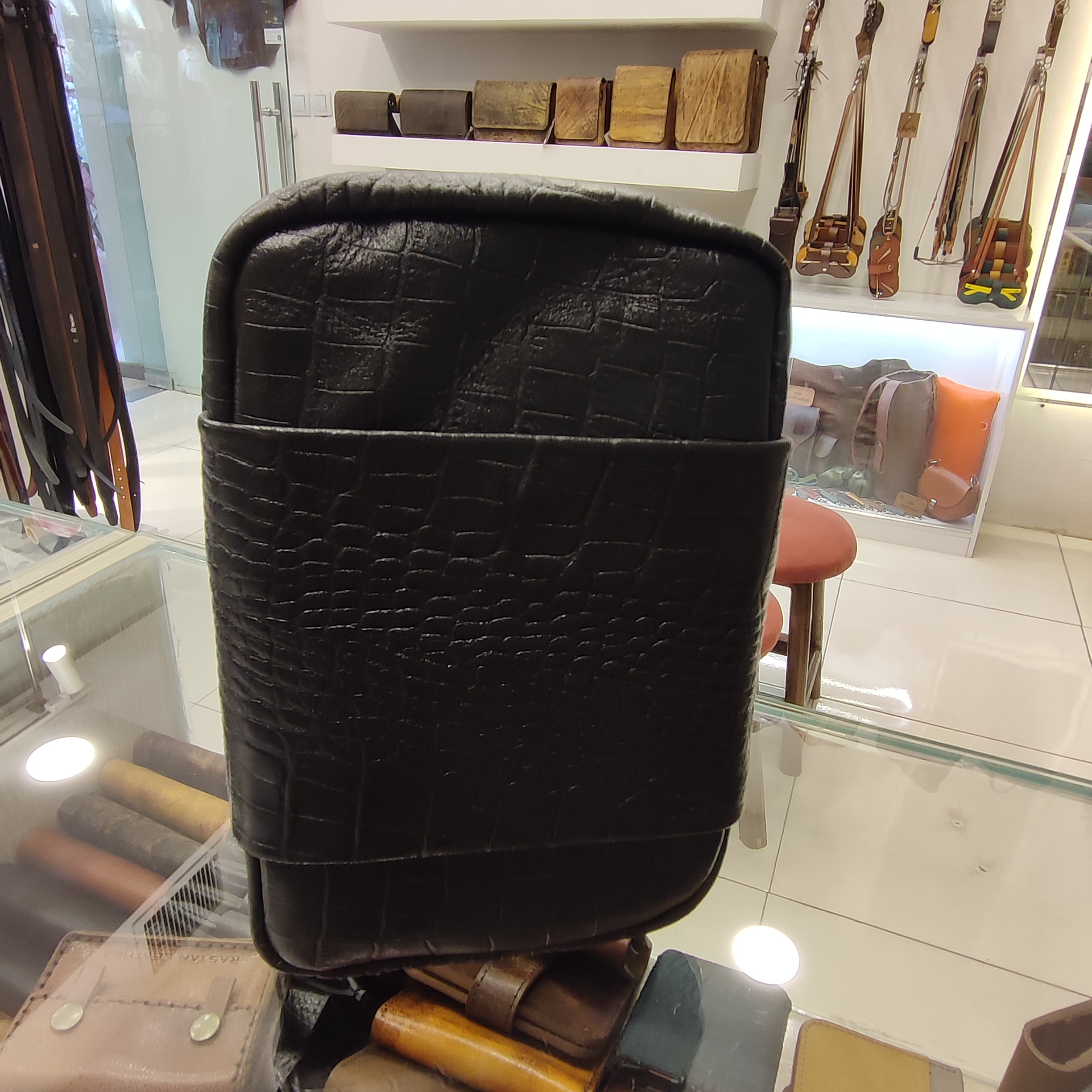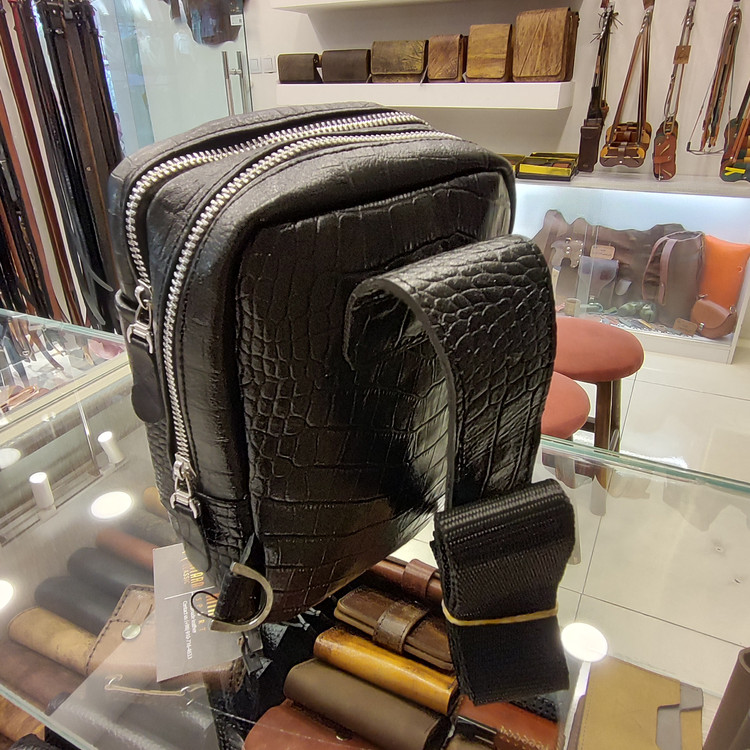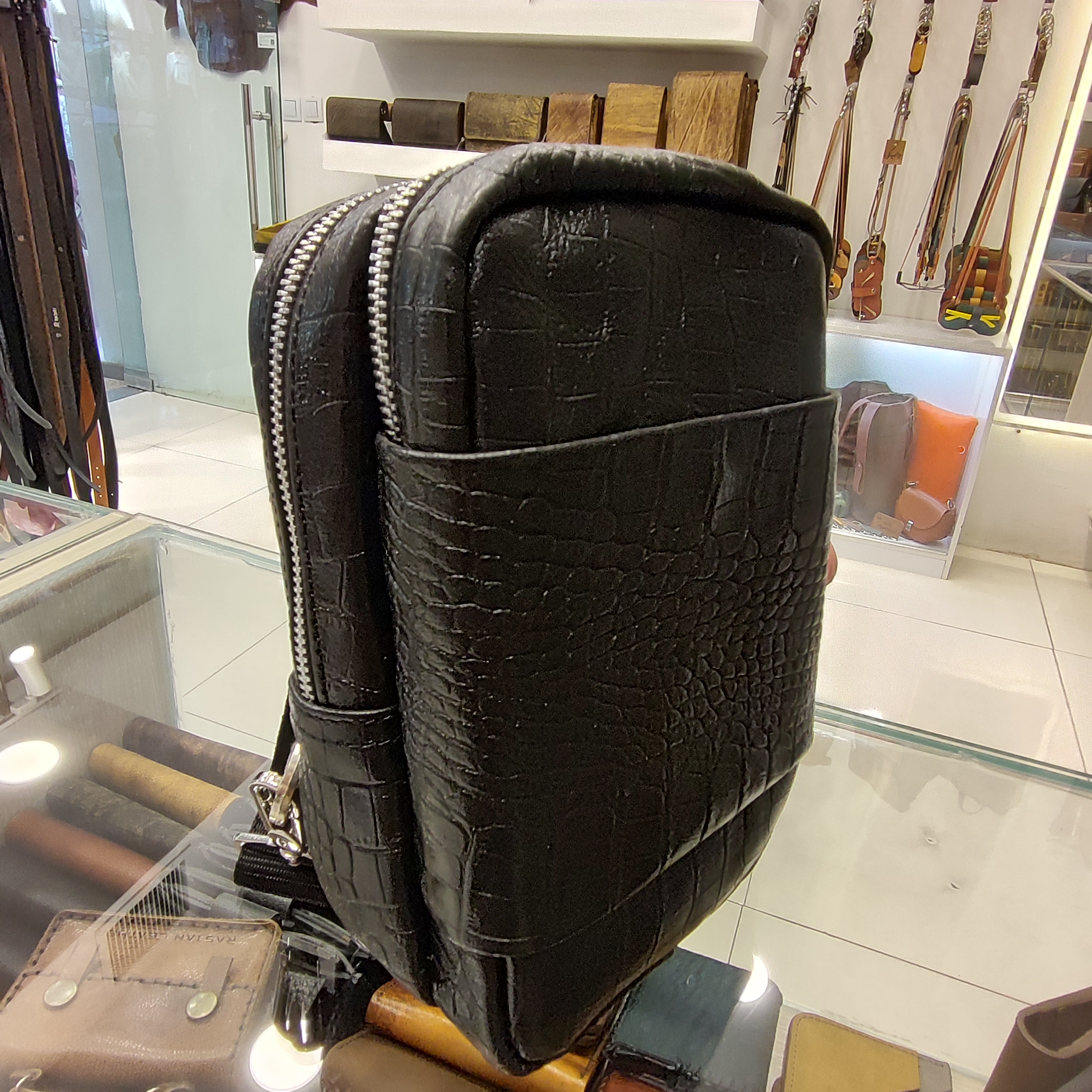 کیف کراس بادی چرمی ساخته شده از چرم گاوی کروکو، دارای دو فضای اصلی و زیپ پشت و تسمه قابل تنظیم راست و چپ و بسیار جادار