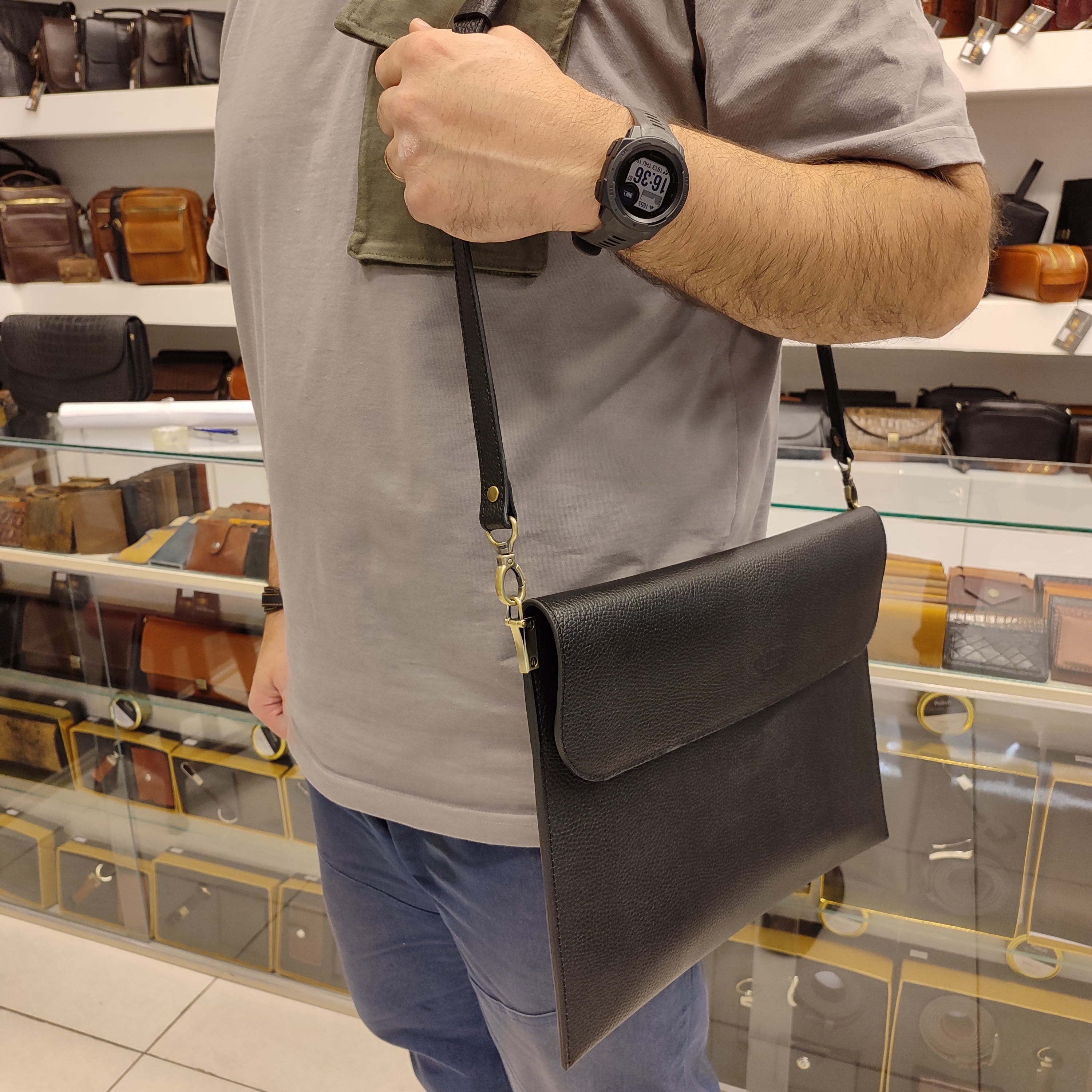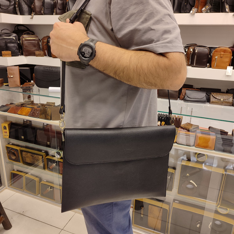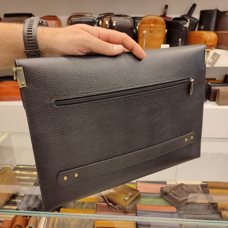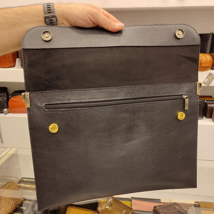 کیف کلاسوری چرمی ساخته شده از چرم گاوی فلوتری، دارای دو فضای بزرگ اصلی بند دوشی و تسمه انگلیسی ضدسرقت پشت، زیپ جلو و پشت کیف و درب کوتاه دکمه مگنتی