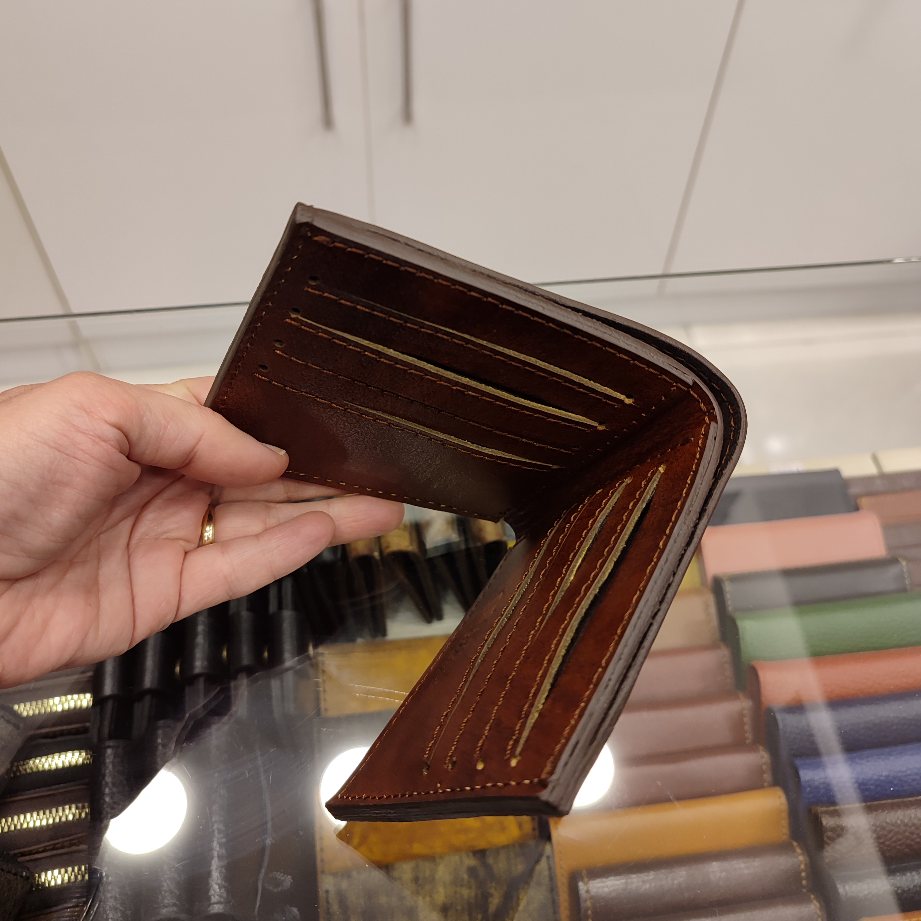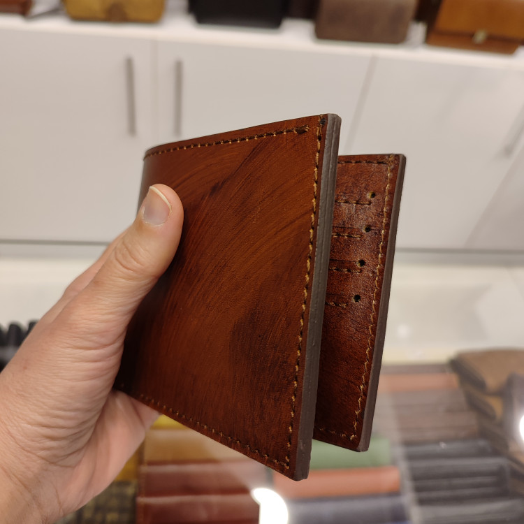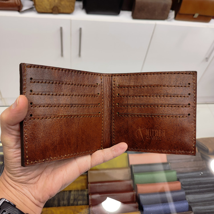 کیف پولی جیبی چرمی ساخته شده از چرمی گاوی دست رنگ اعلا، دارای ۸ جای کارت و دو فضای مدارک داخلی و جای اسکناس جداگانه