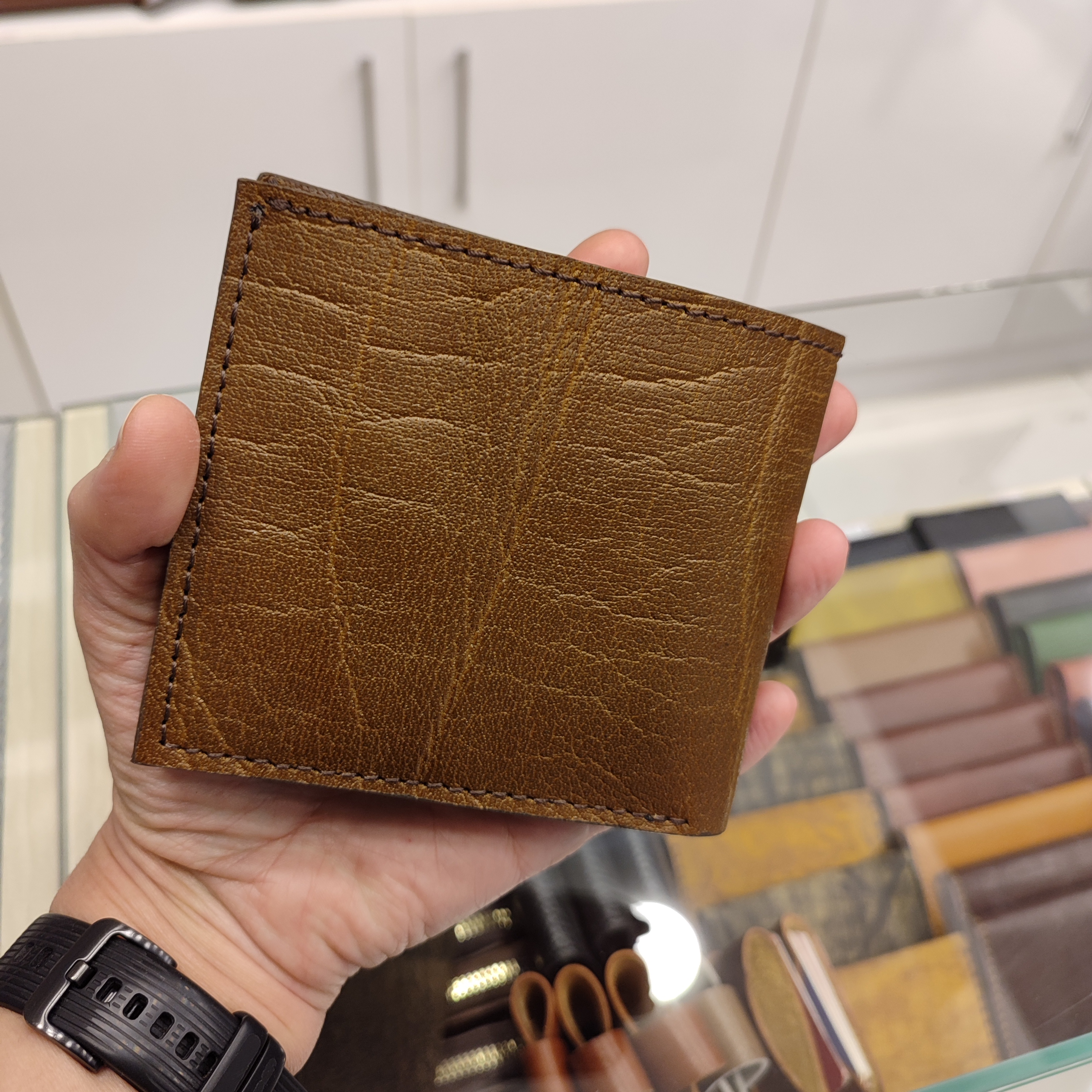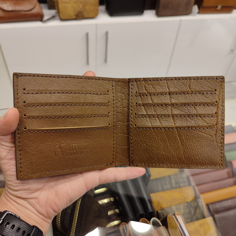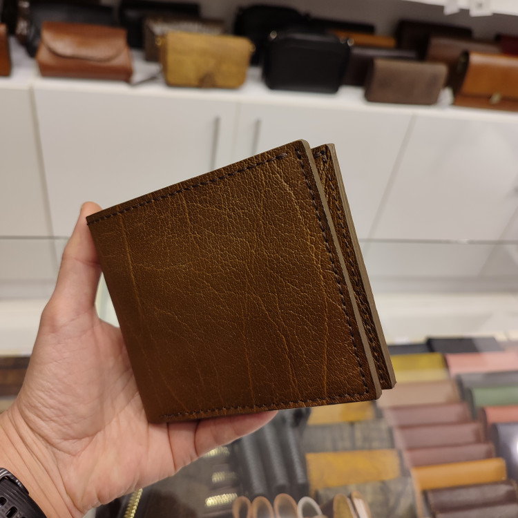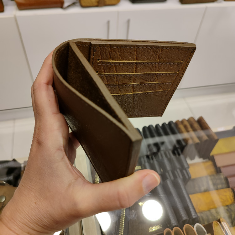 کیف پولی جیبی چرمی ساخته شده از چرمی گاومیشی رگه دار، دارای ۸ جای کارت و دو فضای مدارک داخلی و جای اسکناس جداگانه